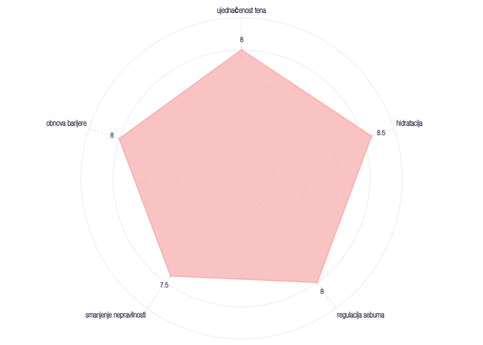 • Niacinamid 10% – doprinosi ujednačenju tena i jačanju zaštitne barijere.